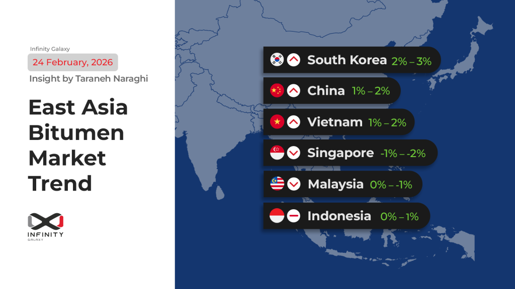 The South Korea bitumen market increased by around +2% to +3%, showing controlled upward movement.